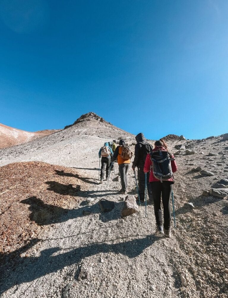 Pick-up e Drop-off no hotel**, transporte, guia especializado em montanha, snacks de trilha e bastões de trekking